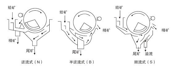 CTS、CTN、CTB系列永磁筒式磁選機磁場分旋轉式、固定式兩種機構,固定式主要適用于弱磁場濕式選別細顆粒的強磁性物質,或者除去非磁性礦物中的強磁性礦物,當漿流入磁場區時,其中強磁性礦物被吸附在圓筒表面,弱磁性和非磁性礦物被分選后排除,而吸附在圓筒表面的強磁性礦物隨圓筒的旋轉被帶出磁場區。旋轉式適用于細粒強(中強)磁性礦物的干選,由于高速旋轉的作用,使磁性顆粒的磁滾翻次數大大高于普通磁選機,這對于破環磁團聚,提高富礦比具有顯著的效果,礦物經分選后被分離成磁性物和非磁性物兩種,分別從各自的排礦口排出該機,適用于礦石粒度為0.6-6mm的粗選和精選。  同一圓筒可配三種槽體,即順流槽(CTS)選別粒度≤6mm,逆流糟(CTN)選別粒度≤0.6mm,半逆流槽(CTB)選別粒度≤1mm。